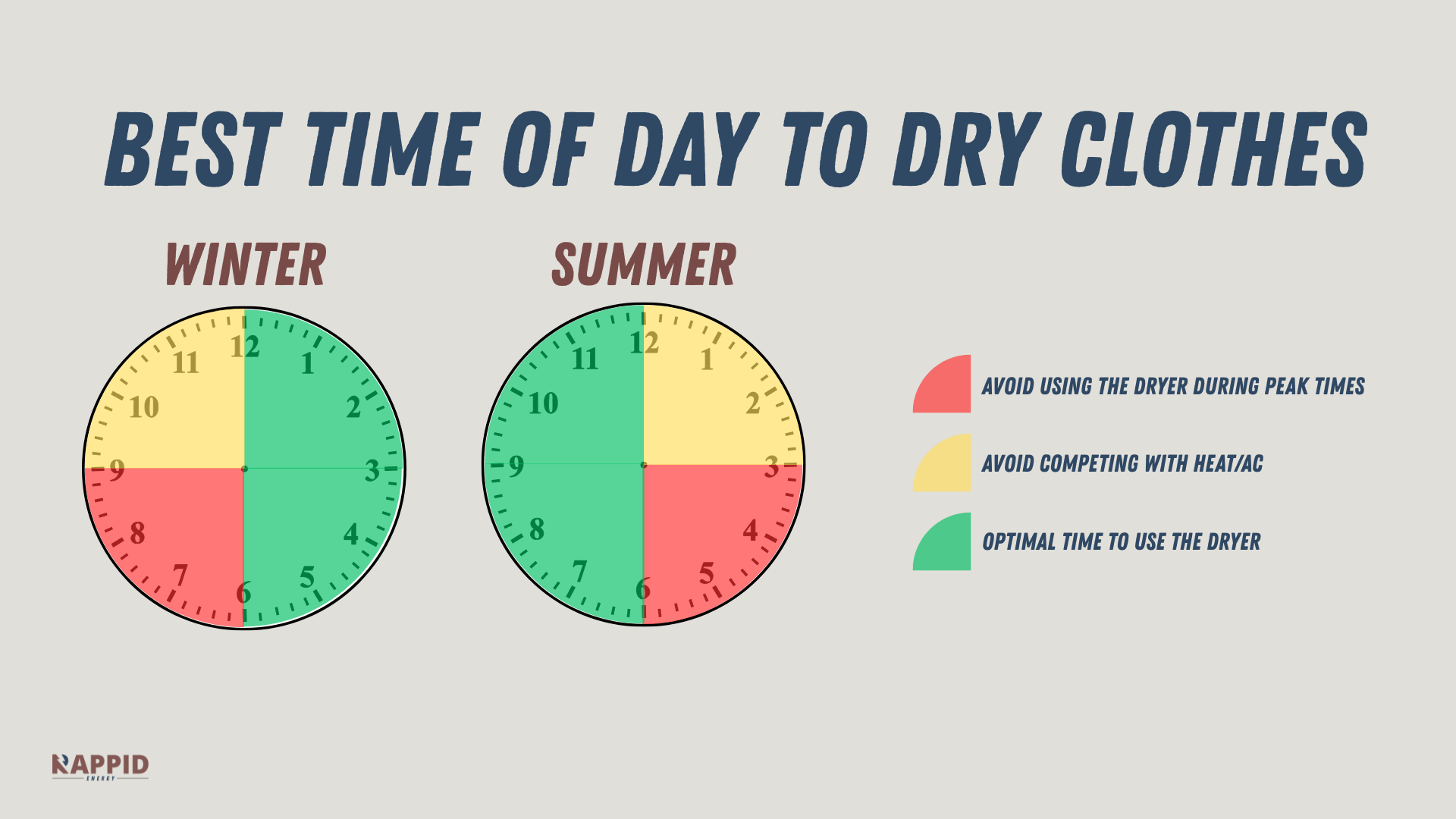 The most expensive time to run your dryer isn't when the heat is highest—it's when your utility company charges the most. If you live in an area with Time-of-Use (TOU) electricity pricing, avoid running the dryer during peak demand hours.